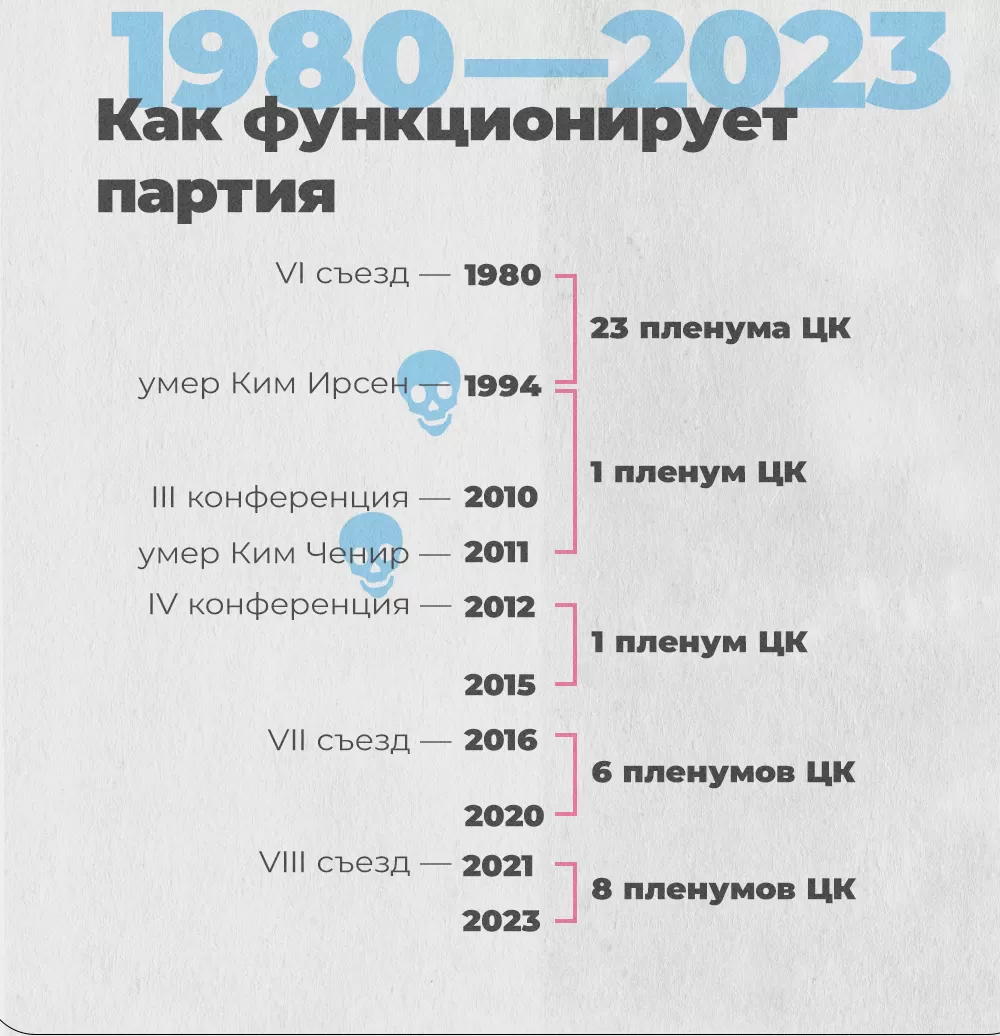Партийные институты начали деградировать с тех пор, как Ким Ирсен победил во внутрипартийной борьбе. Но только после его смерти Ким Ченир отбросил формальные процедуры за ненадобностью. Съезды, конференции, пленумы ЦК — никакие руководящие органы партии не созывались.