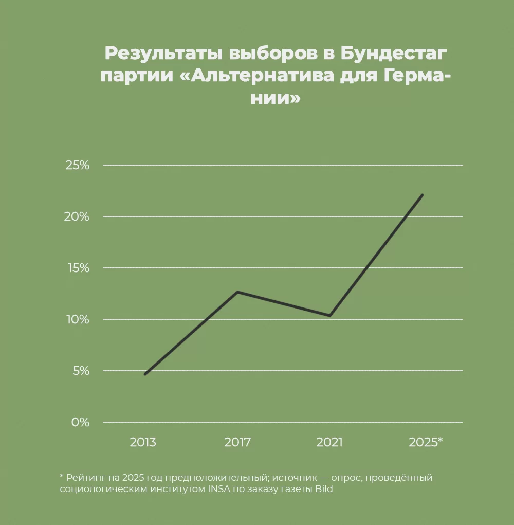 «Я настоятельно рекомендую людям голосовать за AfD. Я считаю, что Алиса Вайдель — очень разумный и здравомыслящий человек. Я думаю, что только AfD может спасти Германию. Конец истории. Людям действительно нужно поддержать AfD, иначе ситуация в Германии станет ещё хуже».8Only @AfD can save Germany // Twitter, 09.01.2025: https://x.com/elonmusk/status/1877435764520239454